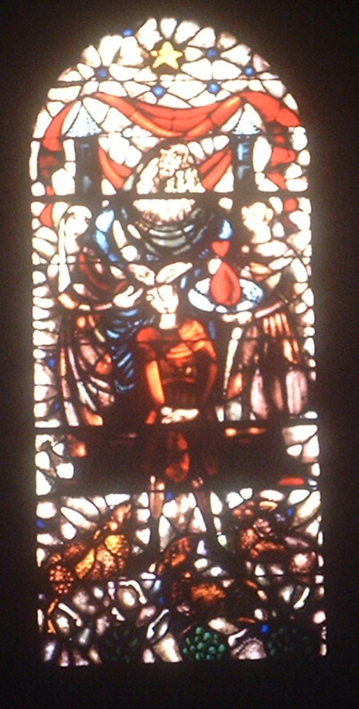 Glasraam in de Huissense stadskerk.Zalving van David...