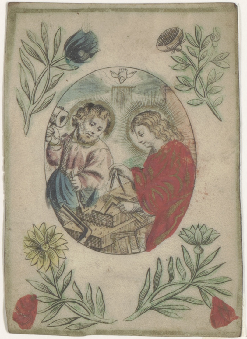 Jozef en Christus; timmermanswerkplaats, ingekleurd