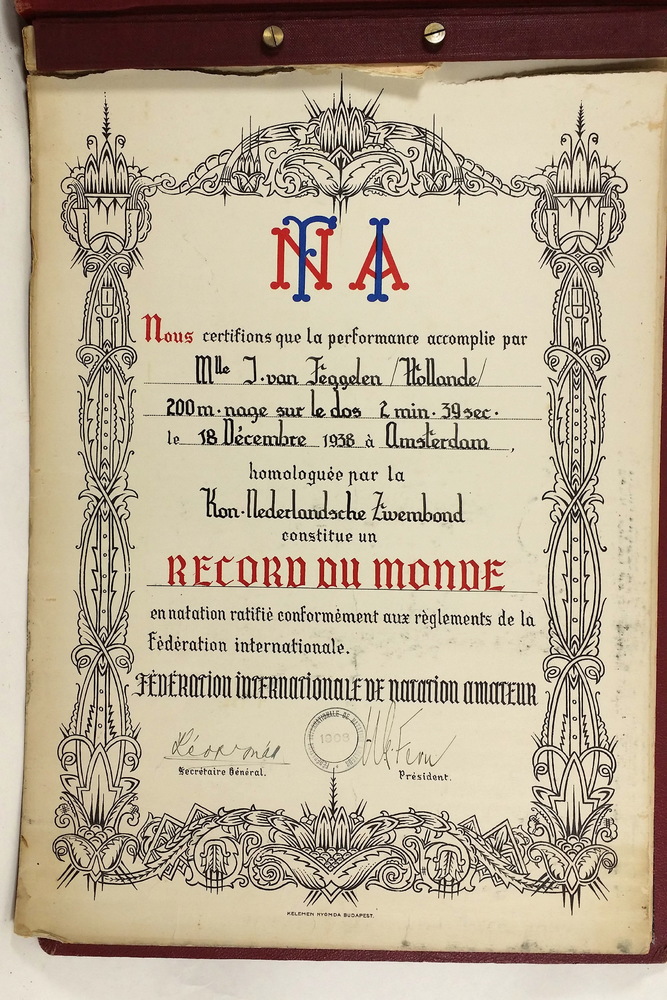 Zeven zwem wereldrecord certificaten 1938 van zwemst...