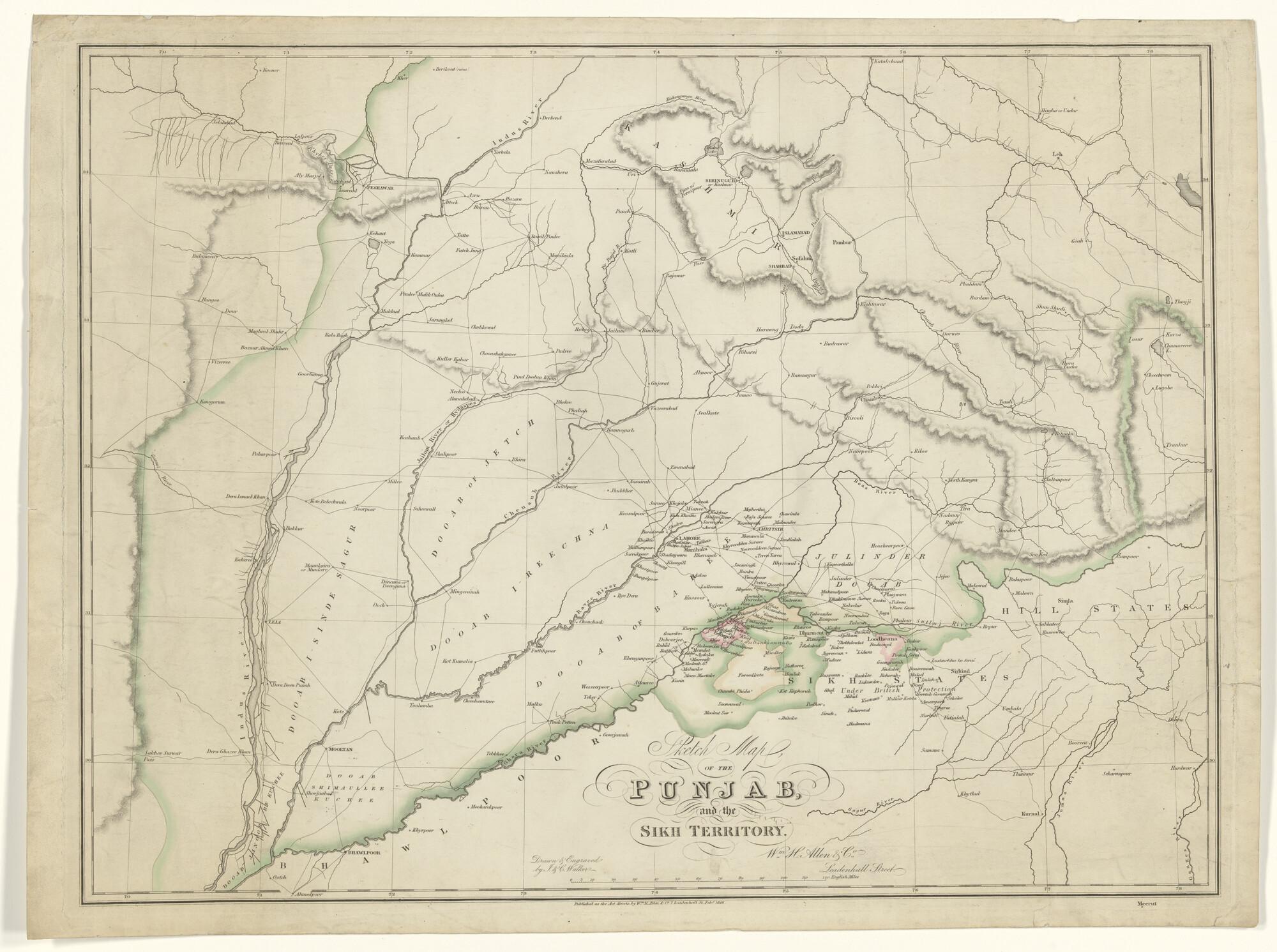 Met de hand gekleurde kaart van de Punjab en het Sik...