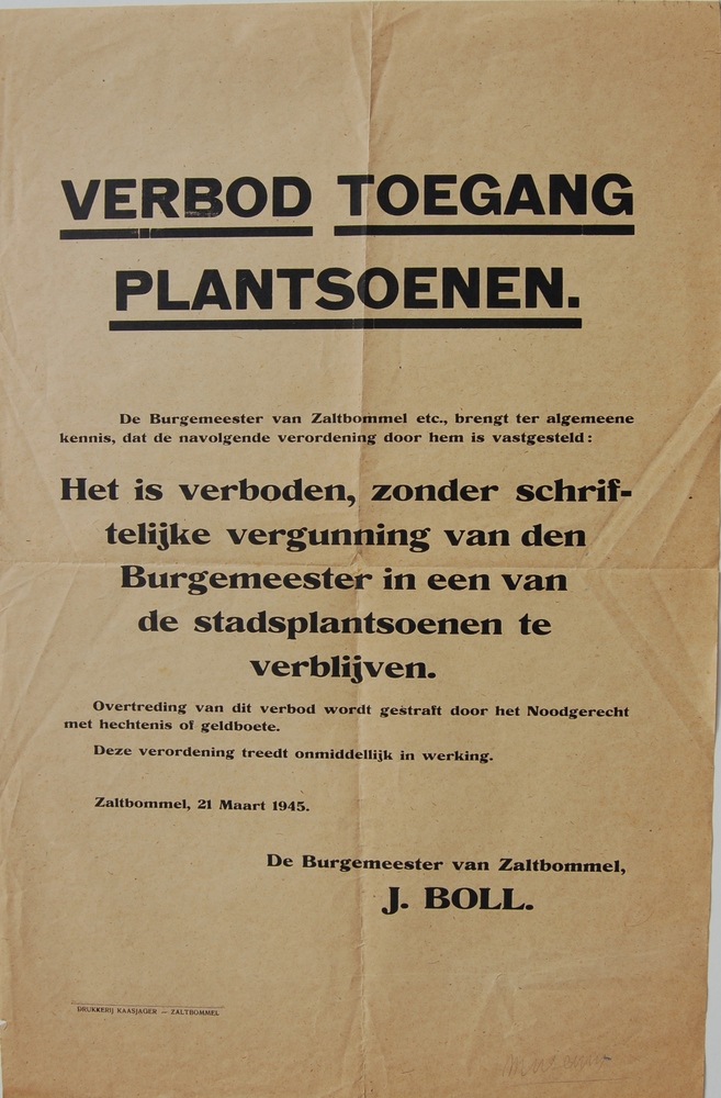 affiche-aankondiging verbod toegang plantsoenen, Zal...