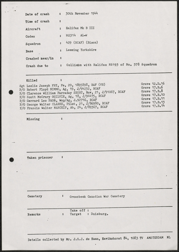 Rapport van een vliegtuigcrash op 30 november 1944