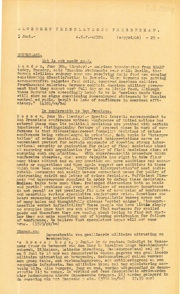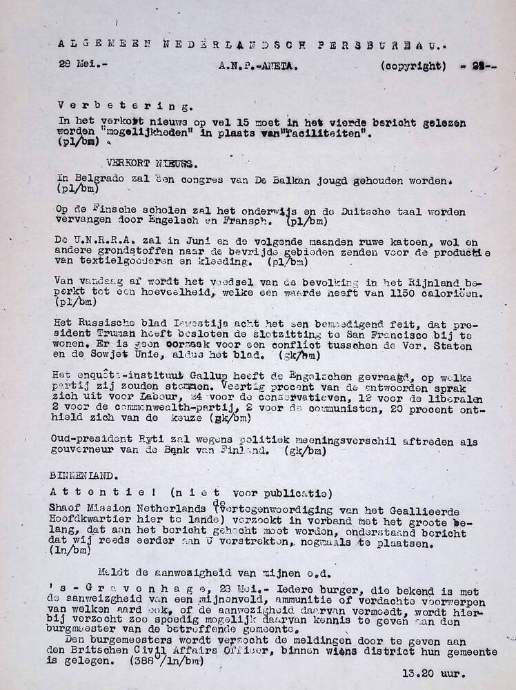 Algemeen Nederlandsch Persbureau, mededelingen, 28 m...