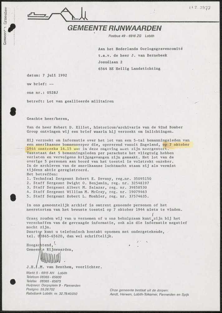 Brief, gemeente Rijnwaarden 7 juli 1992.
