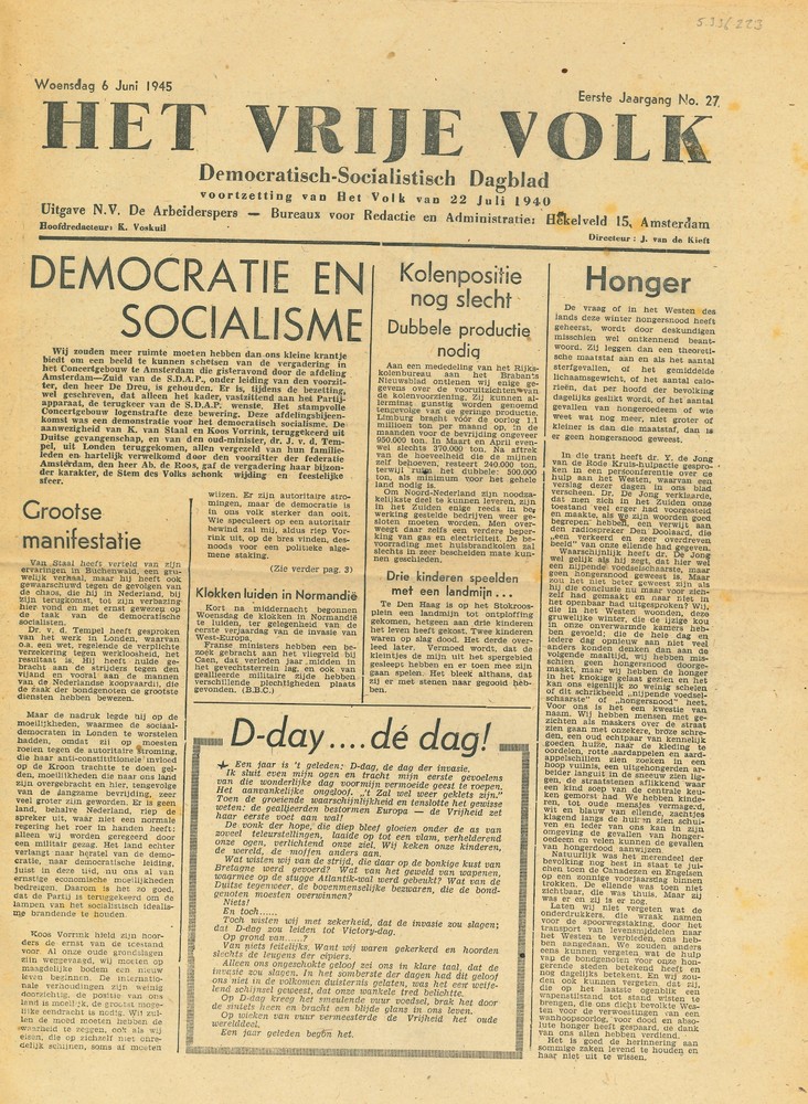 Het Vrije Volk, woensdag 6 juni 1945, eerste jaargan...