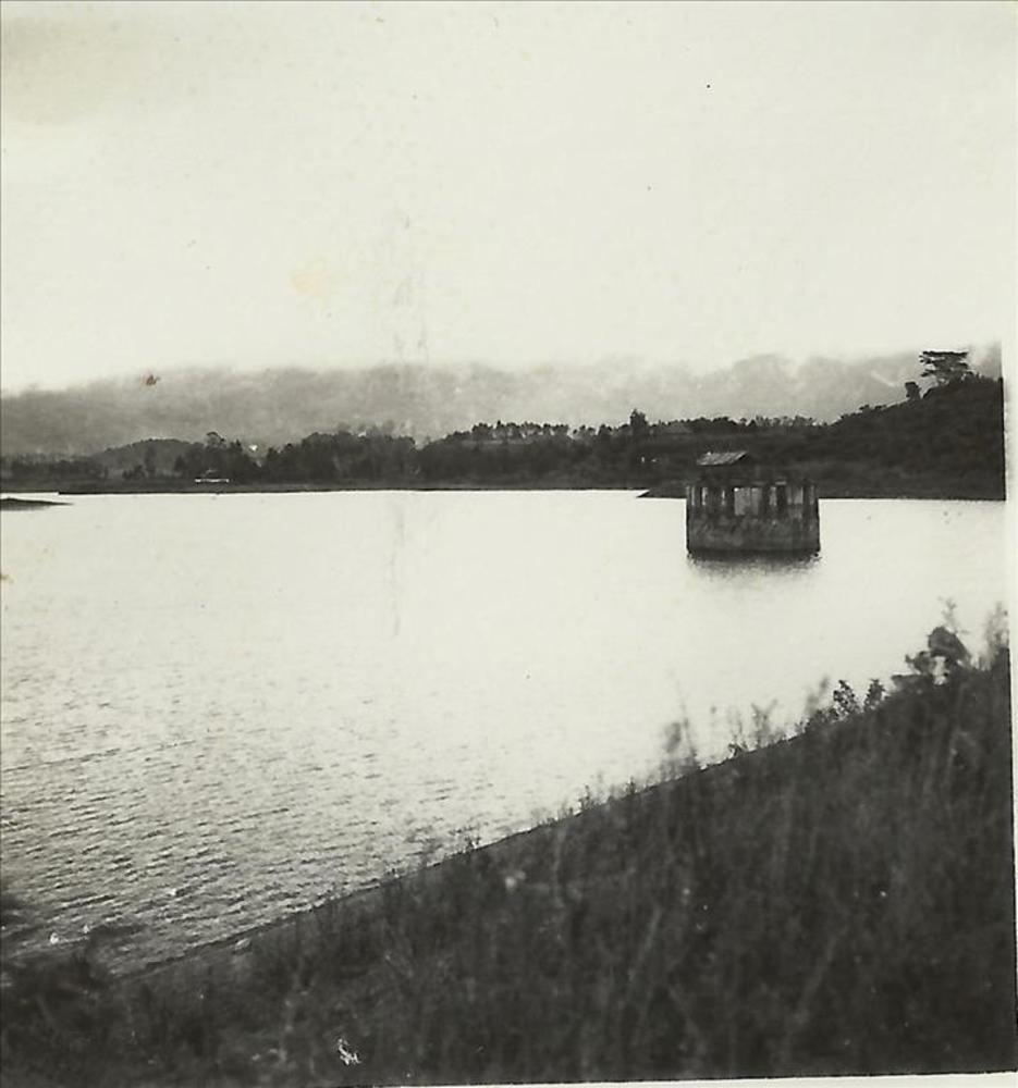 Nederlands Indië; meer, bergen op achtergrond, stene...