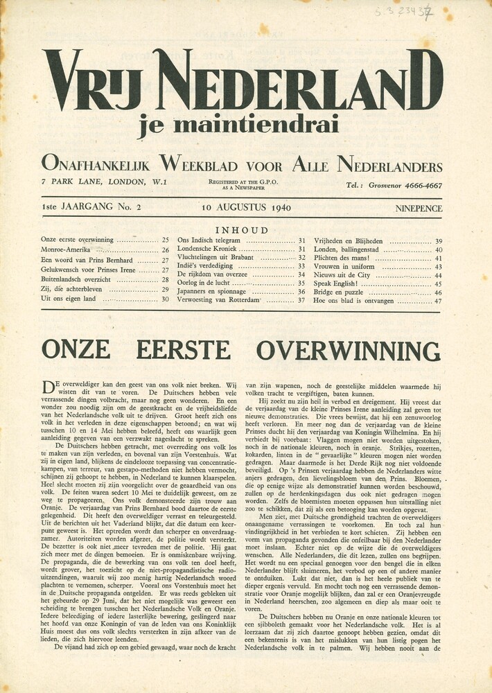 Vrij Nederland, gedrukt te Londen, 1ste jaarg. No 2,...
