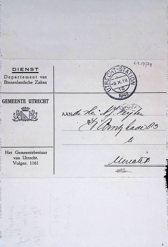 Brief van de gemeente Utrecht aan Mej. A.J. Feijten ...