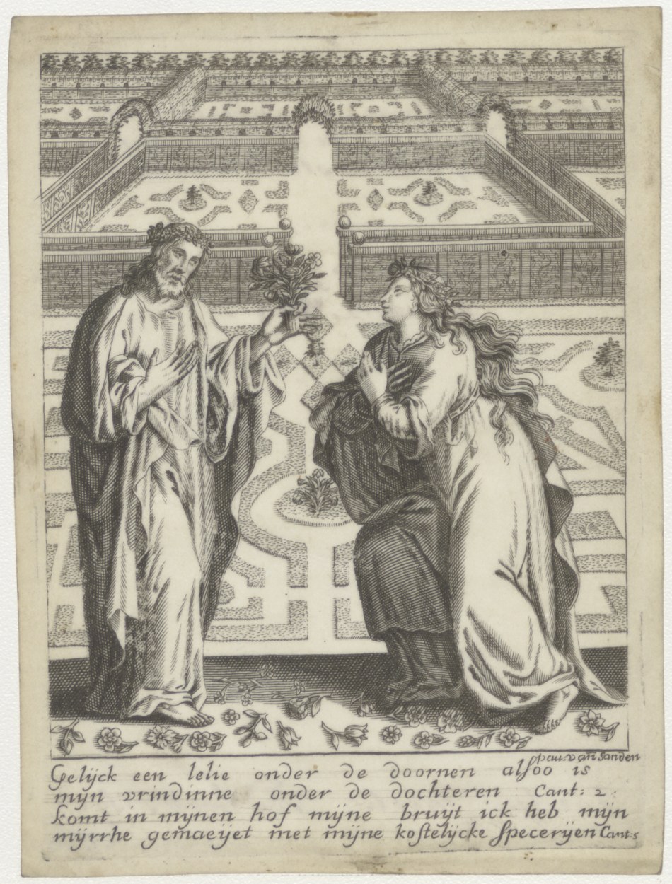 Hof met Christus en vrouw met "... Komt in mijnen ho...