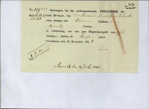 Kwitantie, klapwakersgeld, 1843