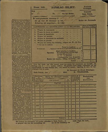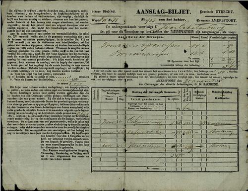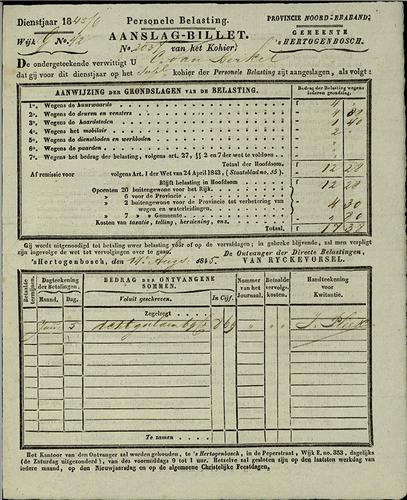 Aanslagbiljet, personele belasting, 1845