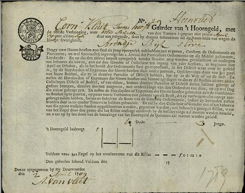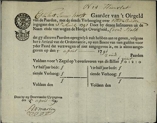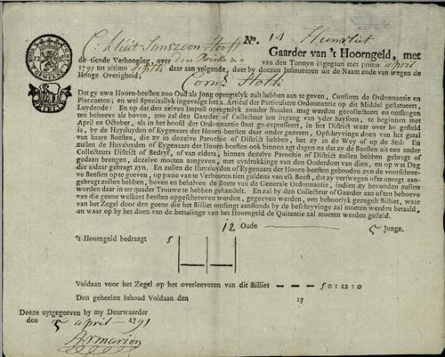 Belastingformulier, hoorngeld, 1791