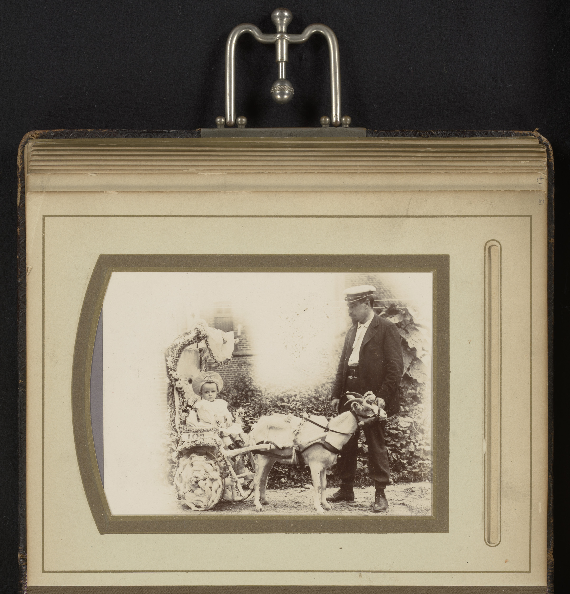 Meisje in een wagen met een geit ervoor, begeleid do...