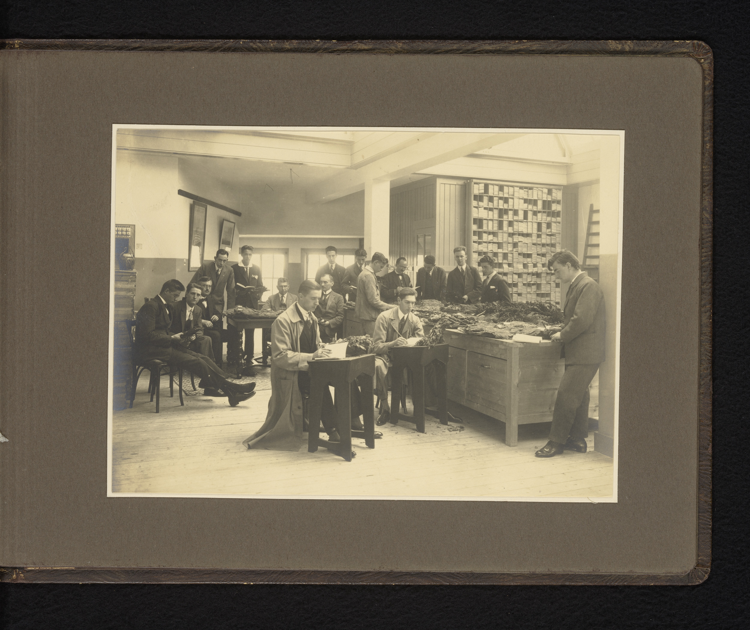Groep mannen controleert tabak in een pakhuis, vermo...
