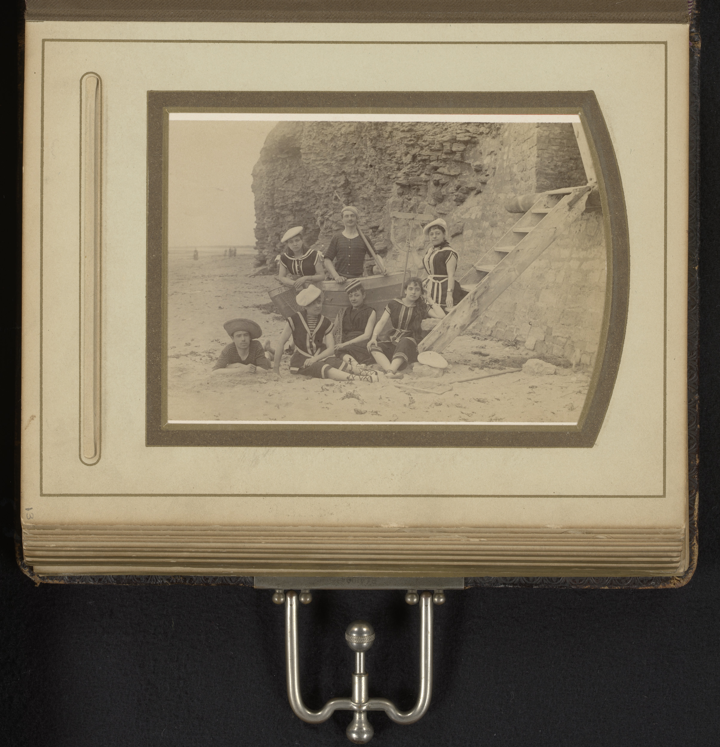 Groepsportret van vijf vrouwen en twee mannen in zwe...