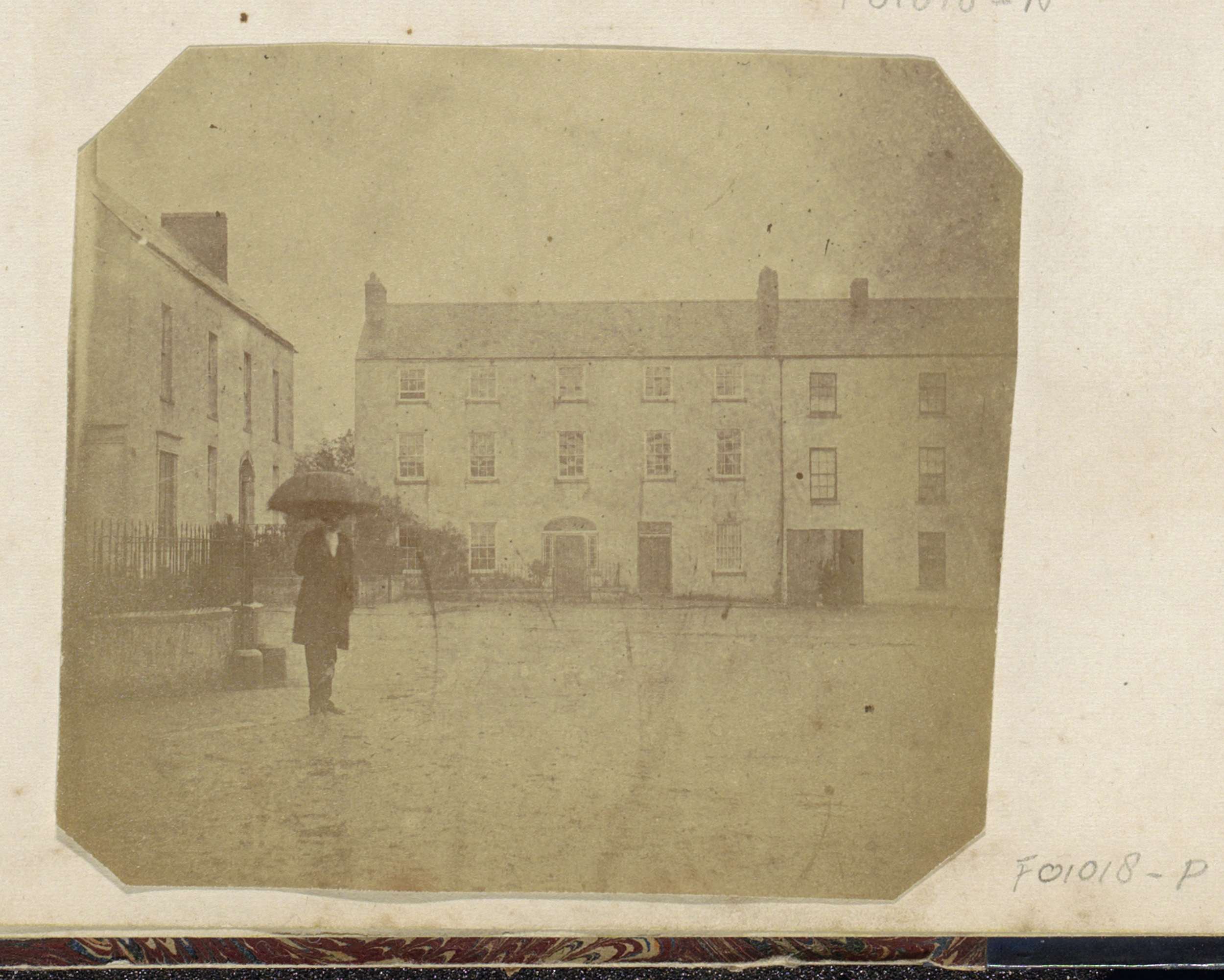 Man met een paraplu staand voor huizen, vermoedelijk...