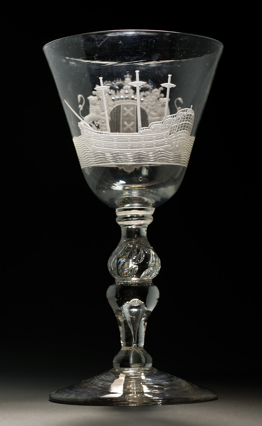 Kelkglas met gravure van driemaster in aanbouw en st...