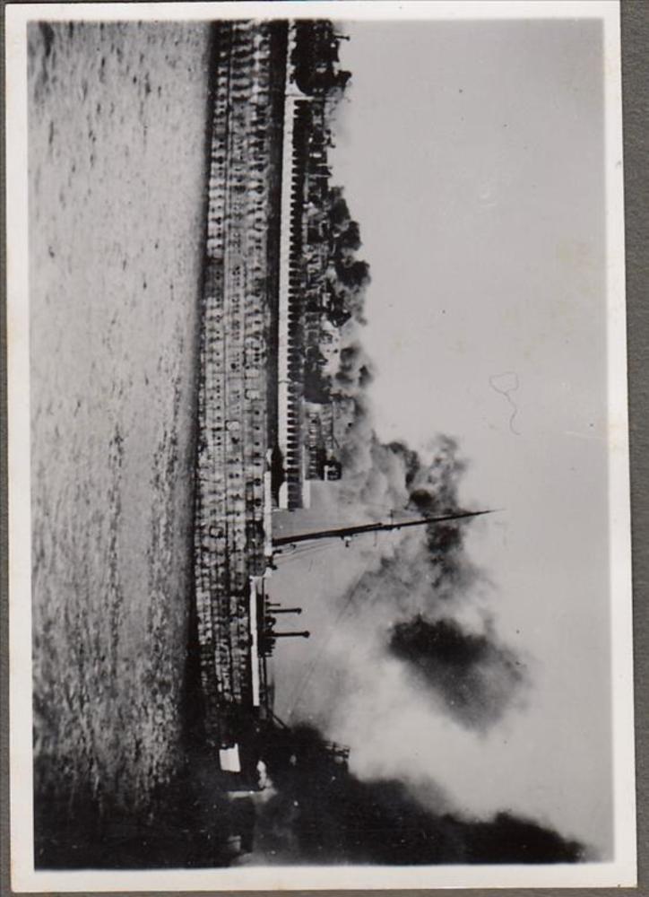 Foto van de zwartgeblakerde en brandende afgemeerde ...