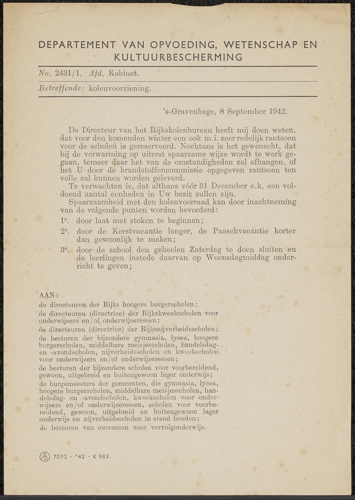 Brief van het Departement van Opvoeding, Wetenschap ...