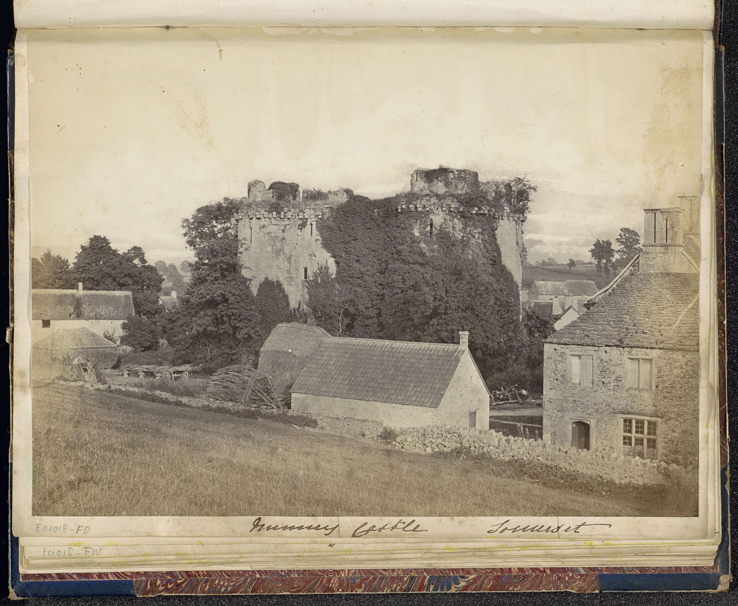 Gezicht op het kasteel van Nunney en de omliggende g...