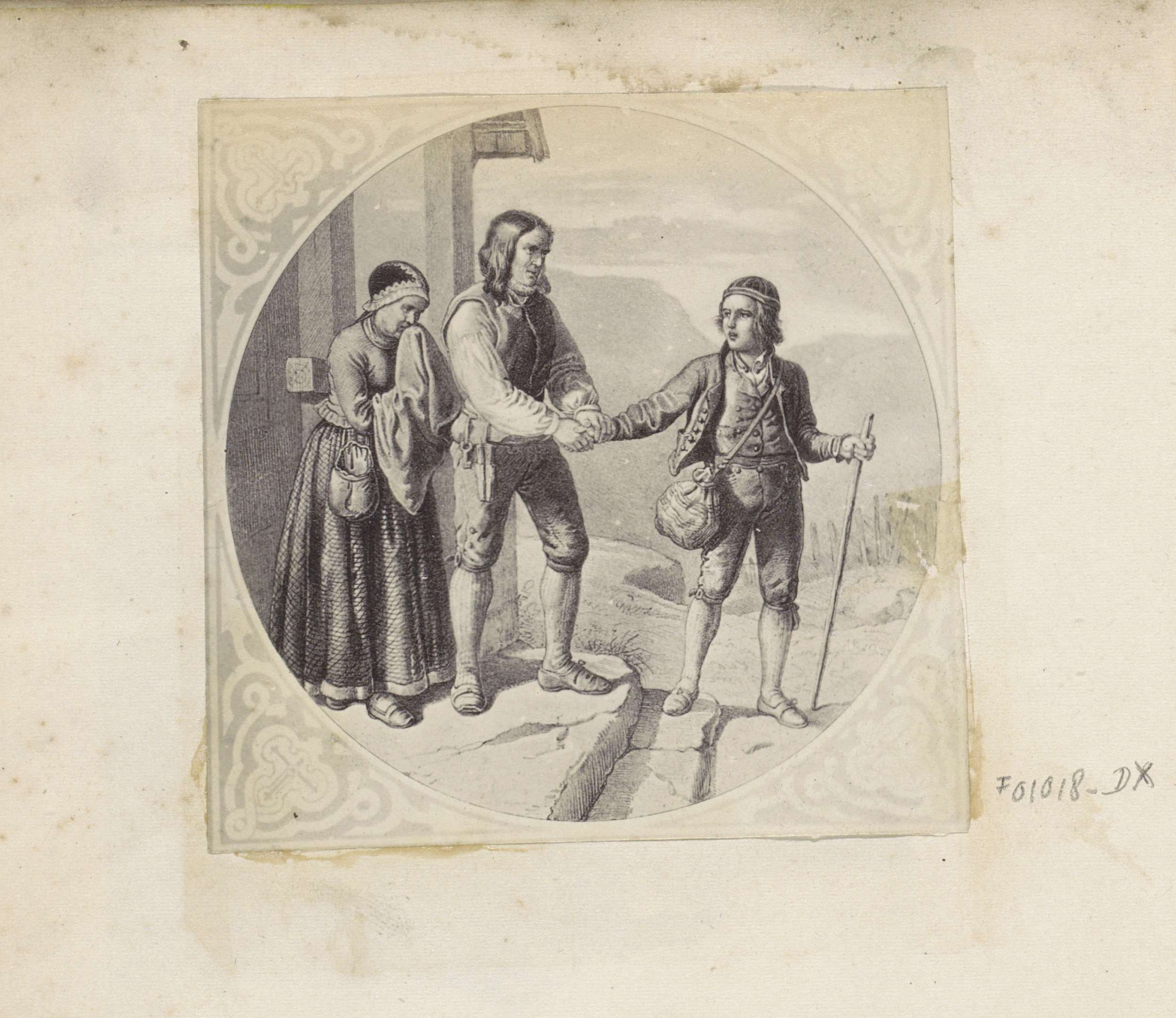 Fotoreproductie van een prent van een begroetingstaf...