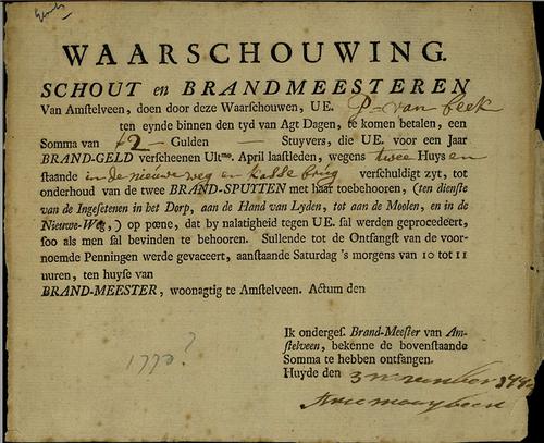 Belastingformulier, brandverzekeringsbelasting, 1770