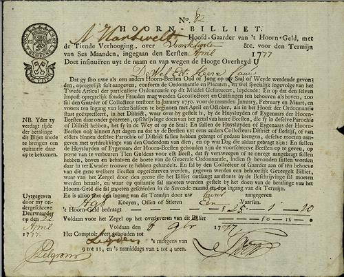 Belastingformulier. hoorngeld, 1777