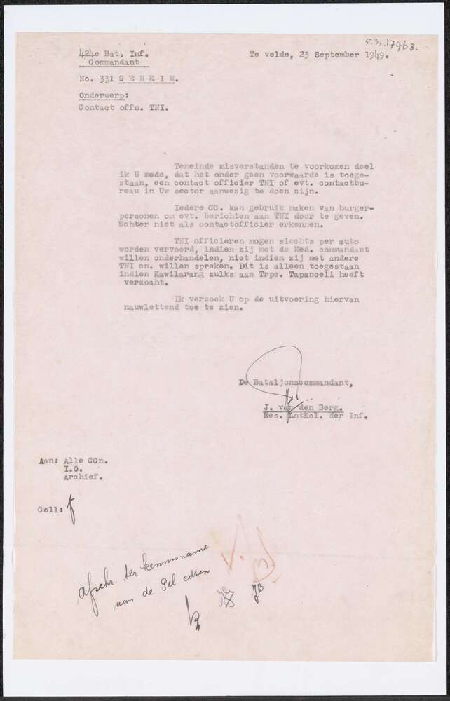 Brief van de commandant 424e Bat. Inf over bestandss...