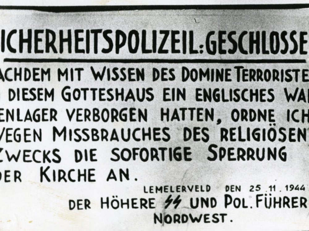 Aangeplakt Duits bord over sluiting kerk Lemelerveld...