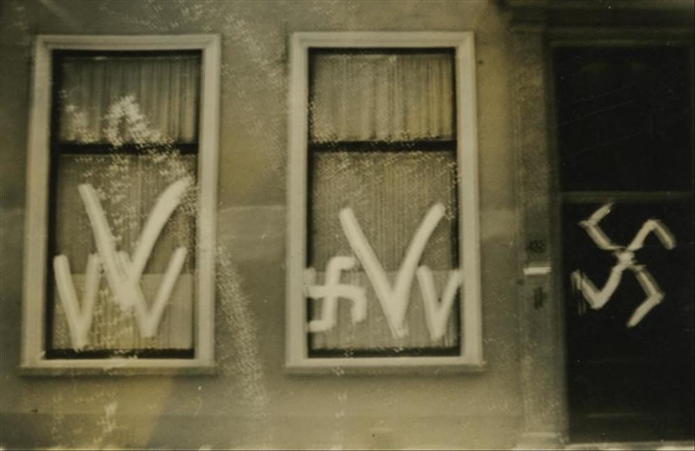 woonhuis beklad met hakenkruizen en V tekens
