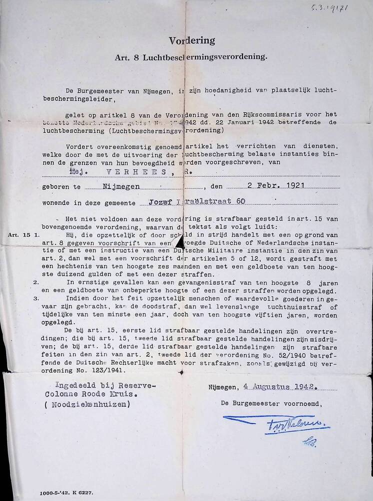 Brief met vordering volgens art. 8 der Luchtbescherm...