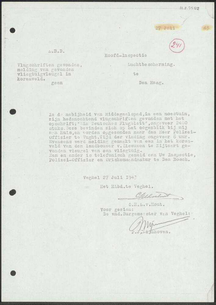 Brief Hoofd luchtbeschermingsdienst Veghel , 27 juli...