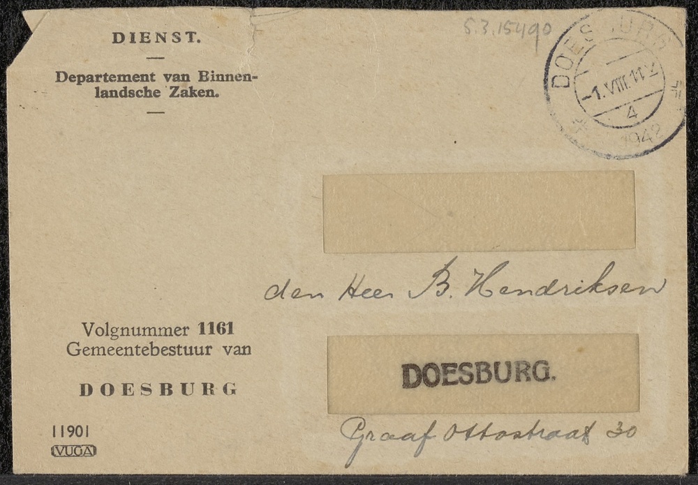 Brief in enveloppe. 23 augustus 1943. Aan den heer G...