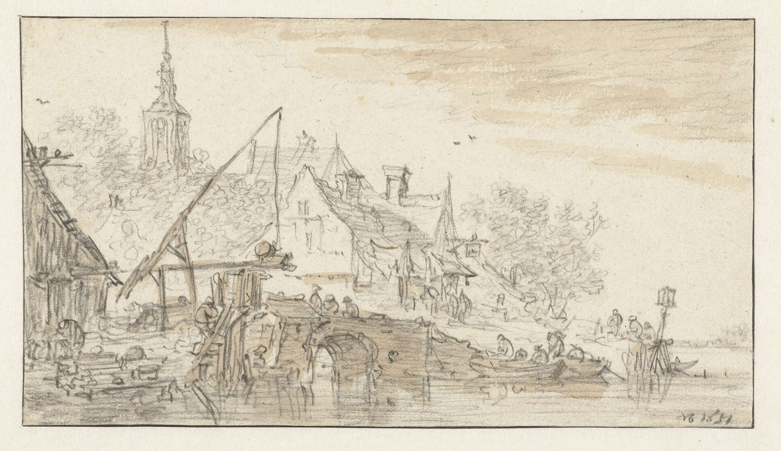 Rivieroever met een hijskraan en enkele boten
