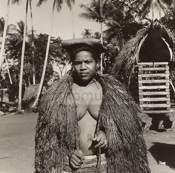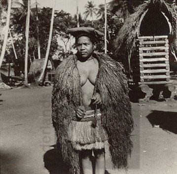 Meisje met cape van raffia, Kiriwina-eilanden (Trobr...