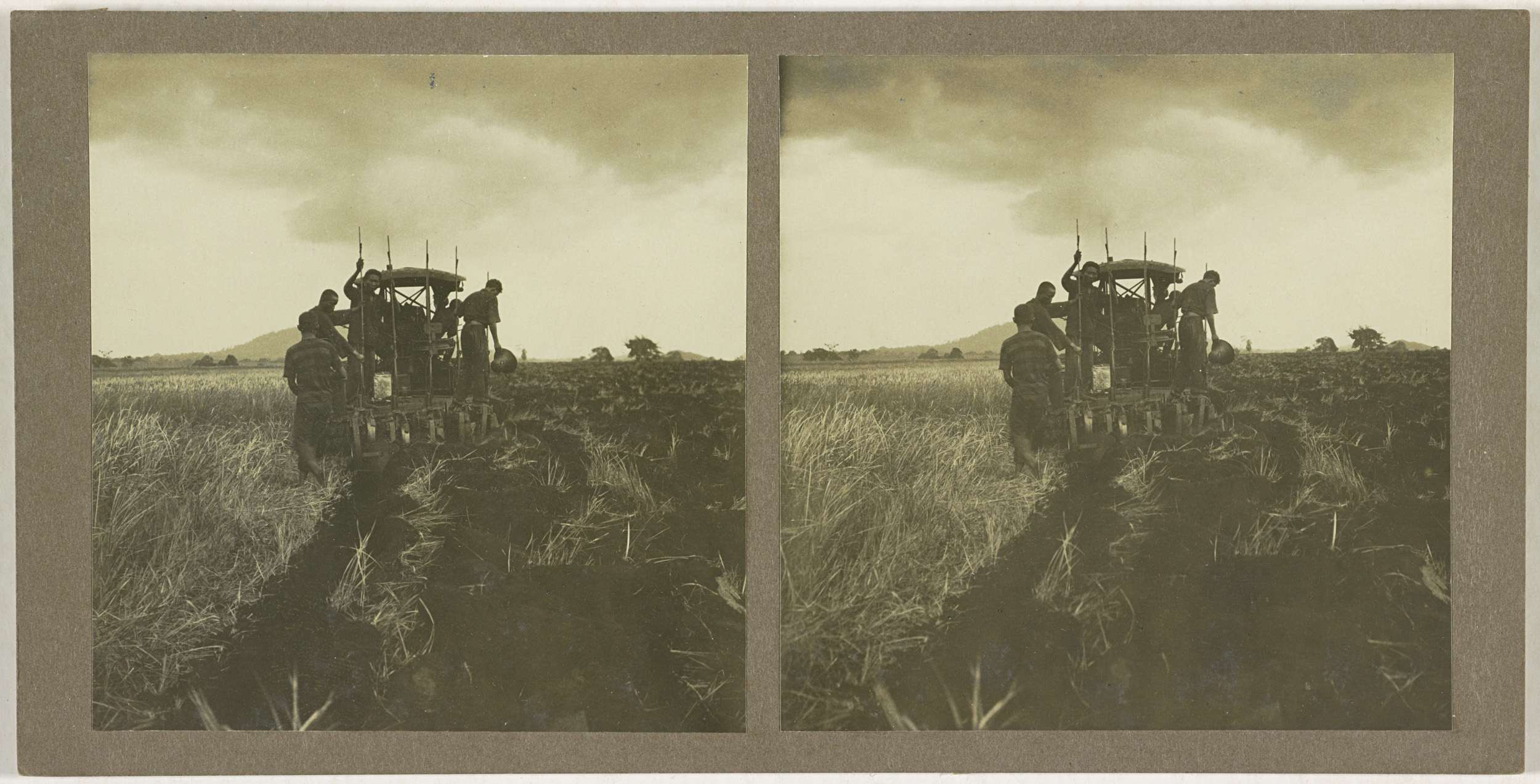 Ploegmachine met landarbeiders, mogelijk op Borneo, ...