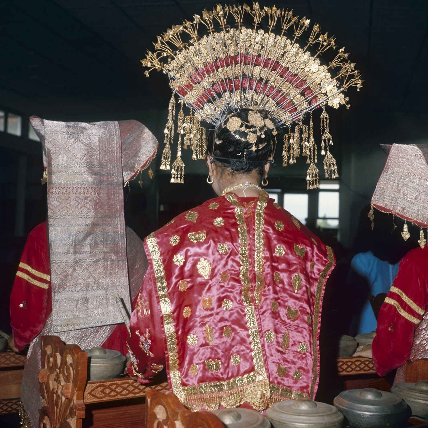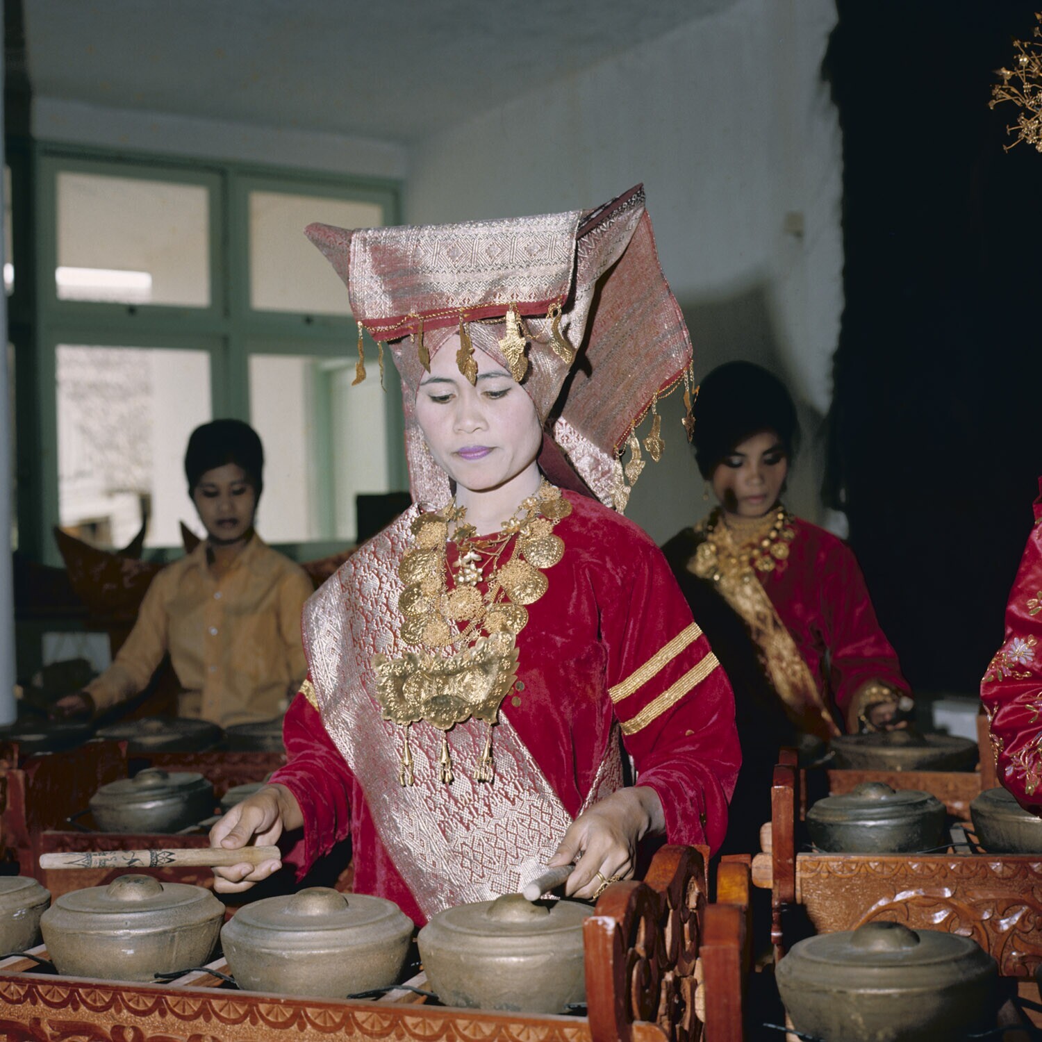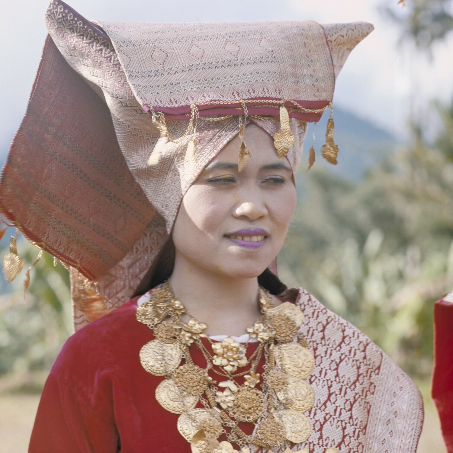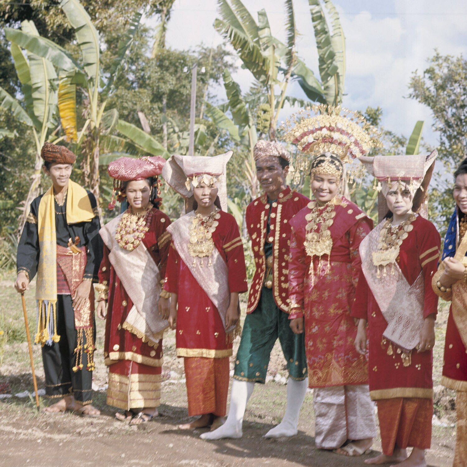 Drie Indonesiërs in kostuum en met traditionele haar...