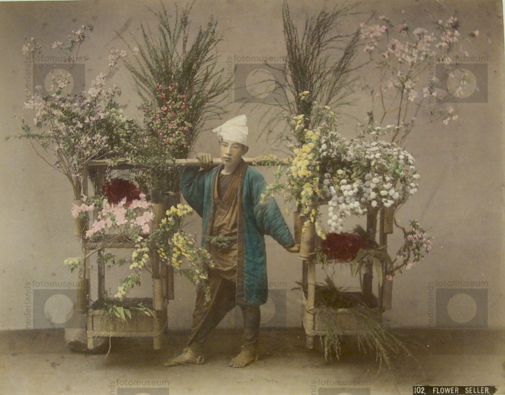 Genrescene, een bloemenverkoper, Yokohama, Japan (18...