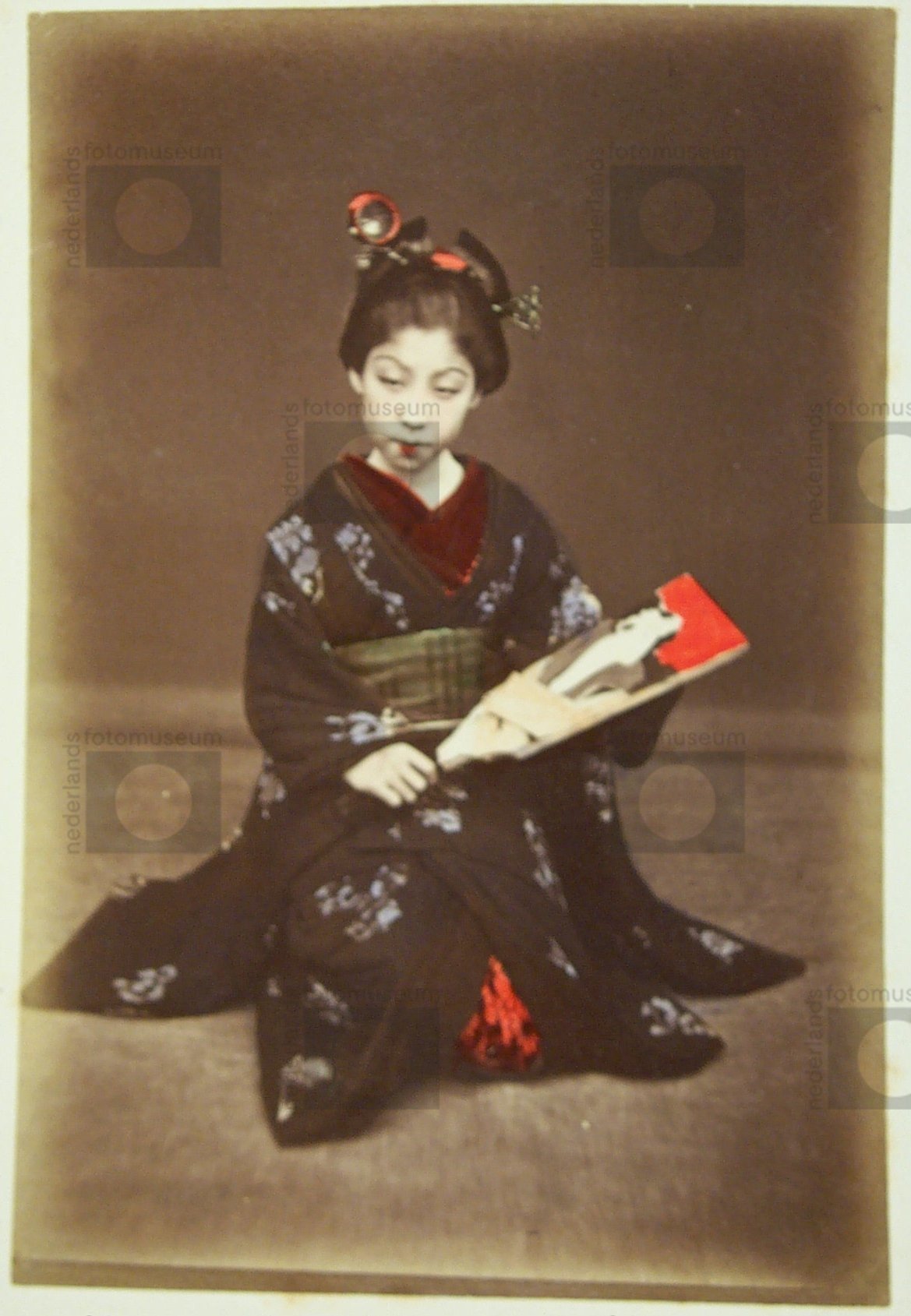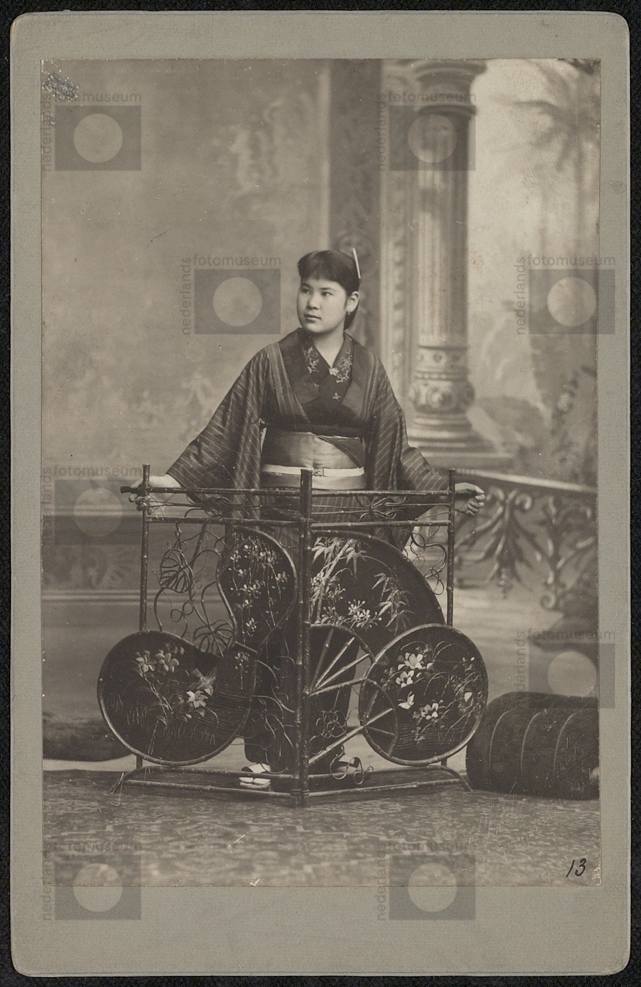 Studioportret van een vrouw in kimono, rugaanzicht, ...