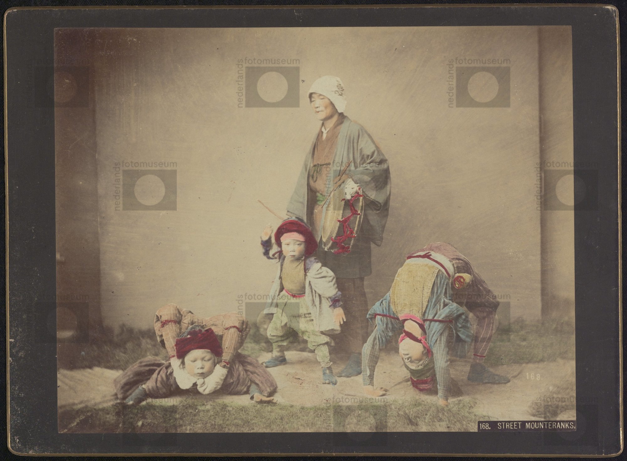 Man met drie jonge acrobaatjes, Japan (1881-1914)