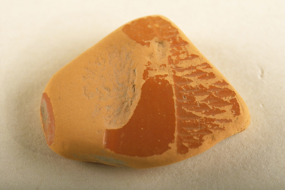 Wandscherf van een spreukbeker van geverfd aardewerk...