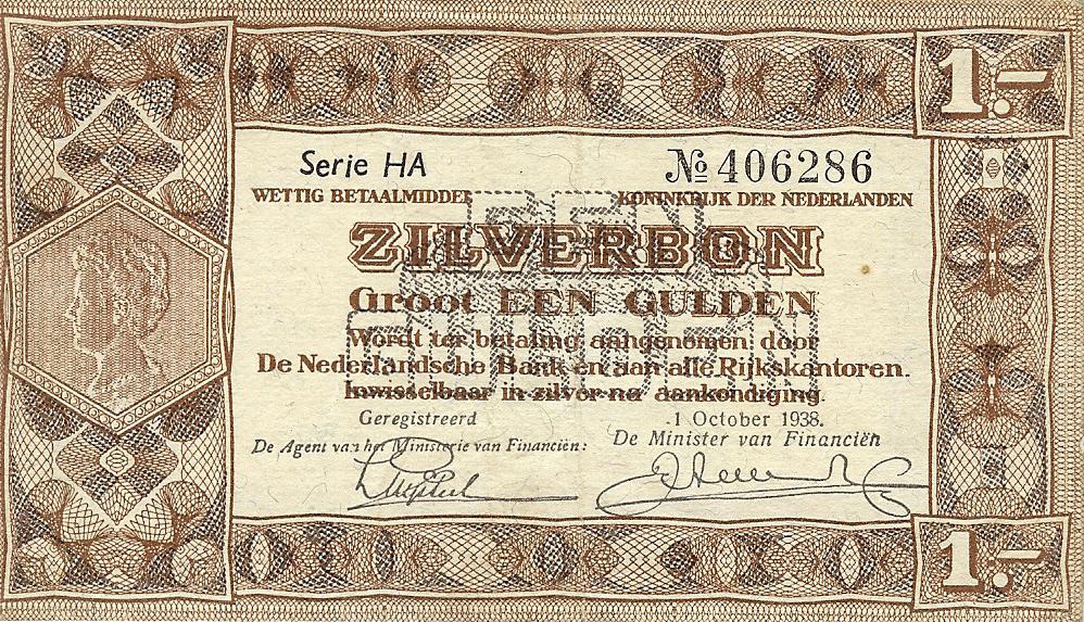 Oorlogsgeld: Zilverbon van 1 gulden, 1938, Nederland