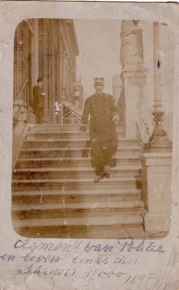 politieagent Clement en schrijver Hobo op het bordes...