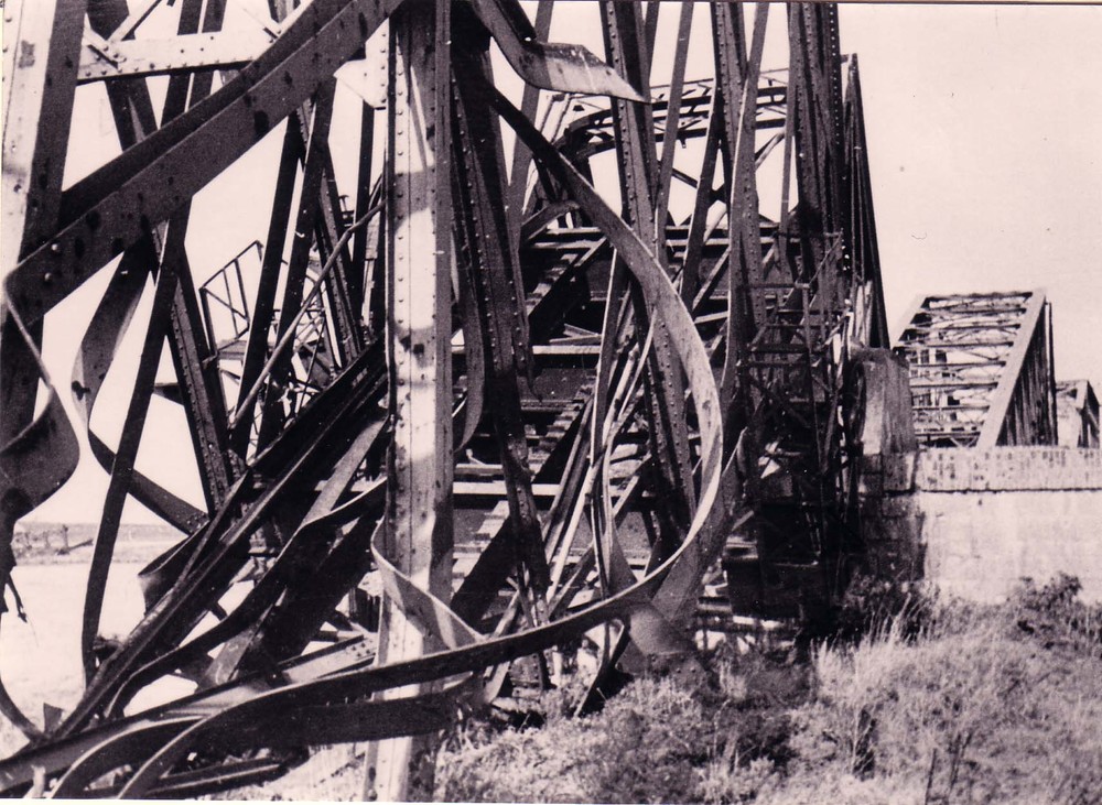 Verwoeste spoorbrug bij Hedel.
