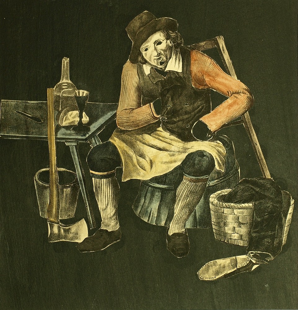 Knipsel van ambachtsman gezeten op een stoel en attr...