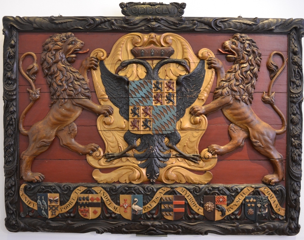 Gepolychromeerd verguld houten wapenbord uit 1656.