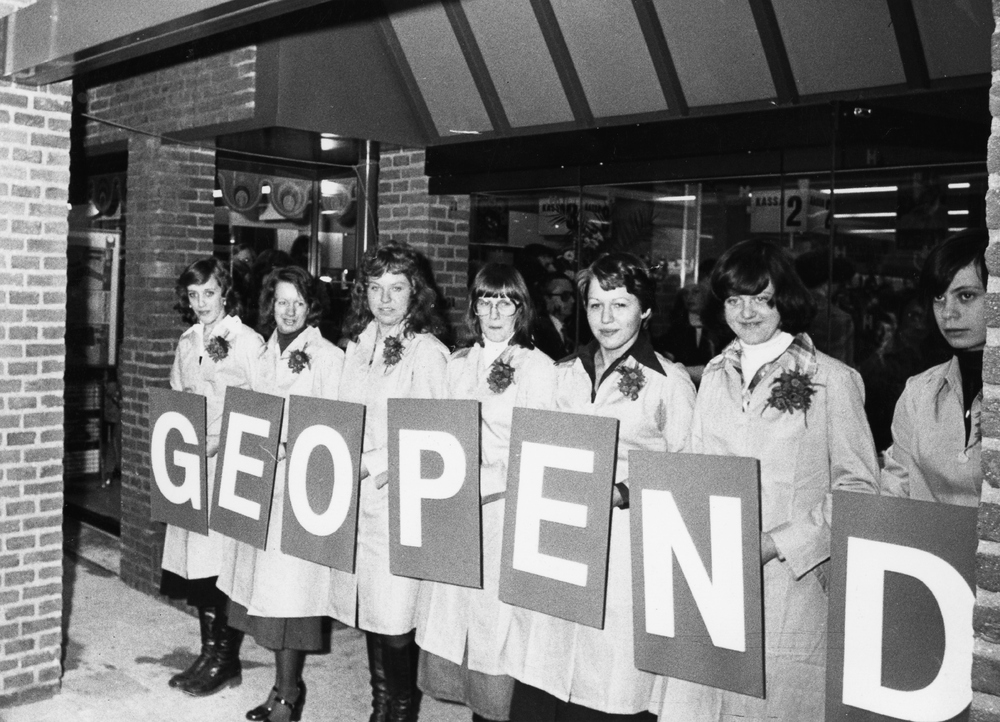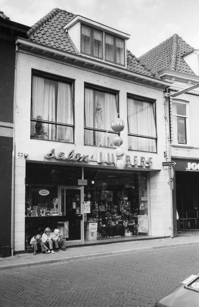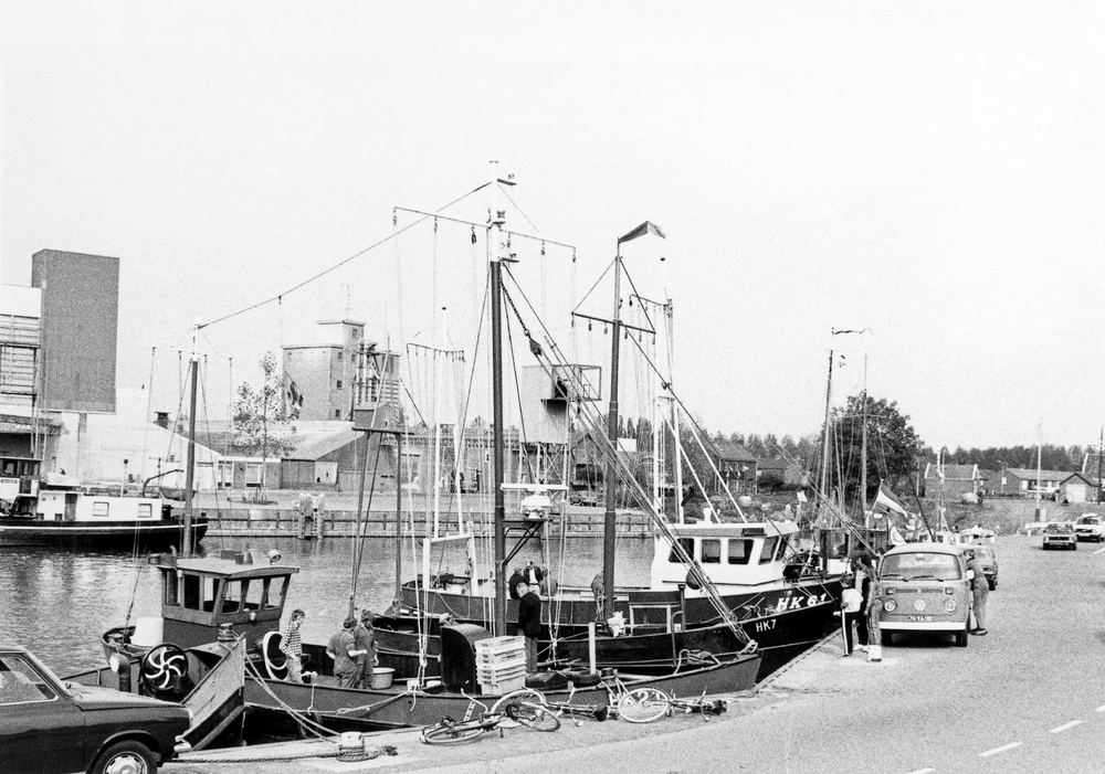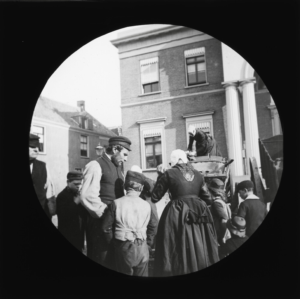 Twee jonge vissersvrouwen staan voor de ingang van e...