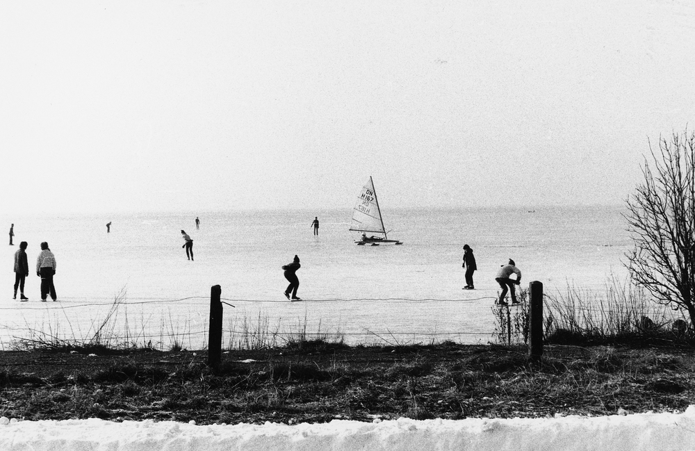 Schaatsers en een ijszeiler op het bevroren Wolderwijd