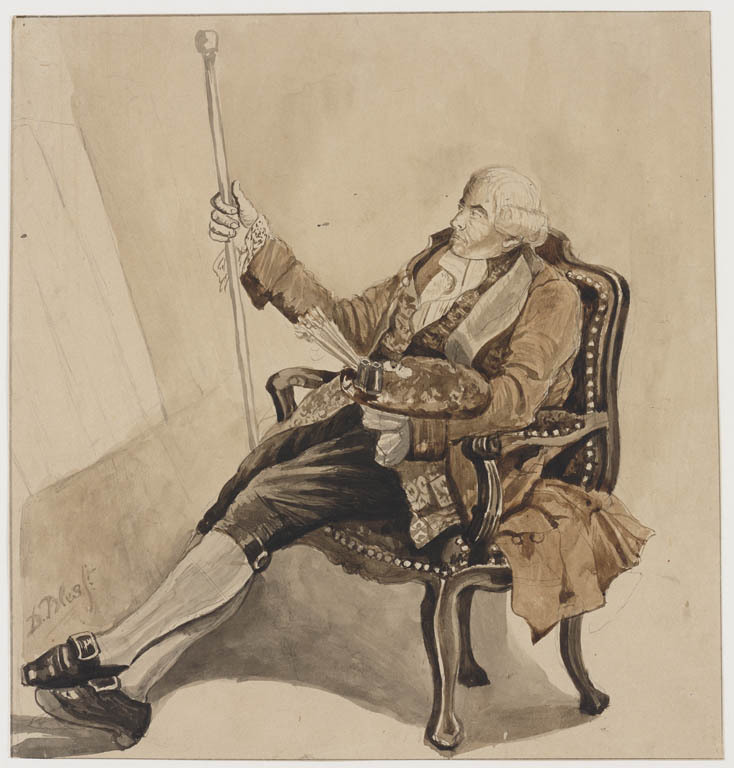Zittende schilder in 18de-eeuws kostuum in atelier