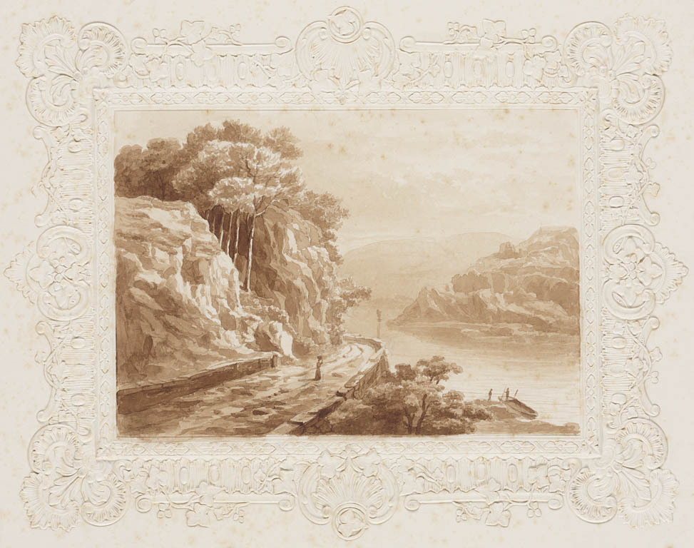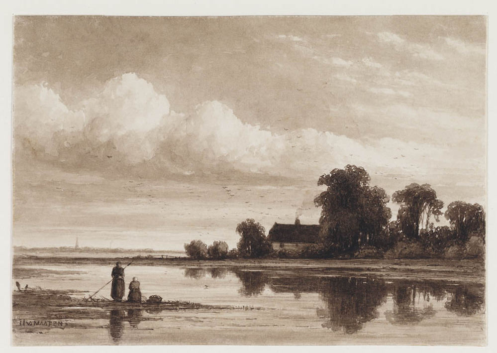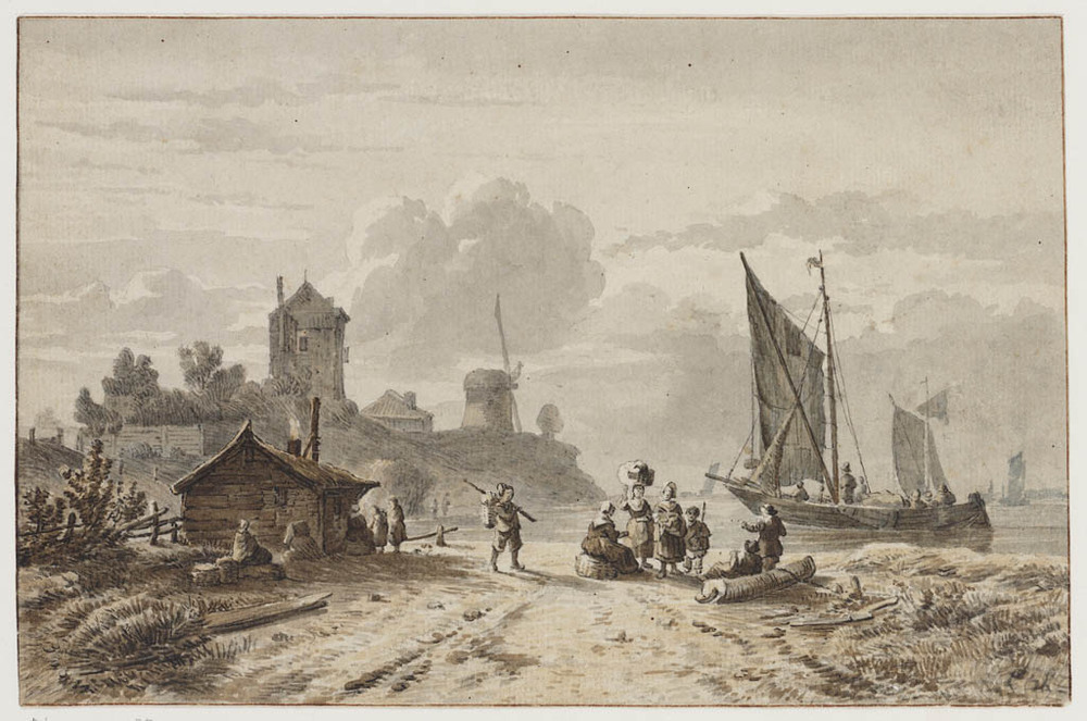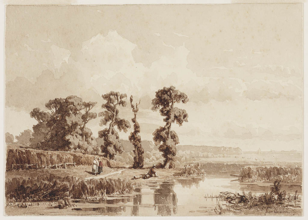 Landschap met drie figuren bij een wateroever